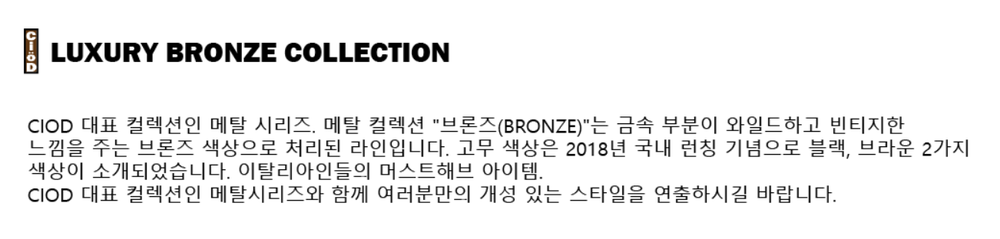 이탈리아 Luca Cantamessa에 의해 탄생한 CiöD는 우리 삶 속에 흔히 볼 수 있는 투박하고 거친 "못"에서 세련된 악세사리로의 화려한 변화. 이질적인 두 물체, 고무와 금속의 조화로운 결합으로 유럽 여러 매체로부터 찬사와 호평을 받으며, 세계 최고의 편집 매장 파리 콜레트 입점에 성공한 CiöD.
