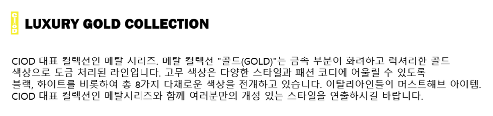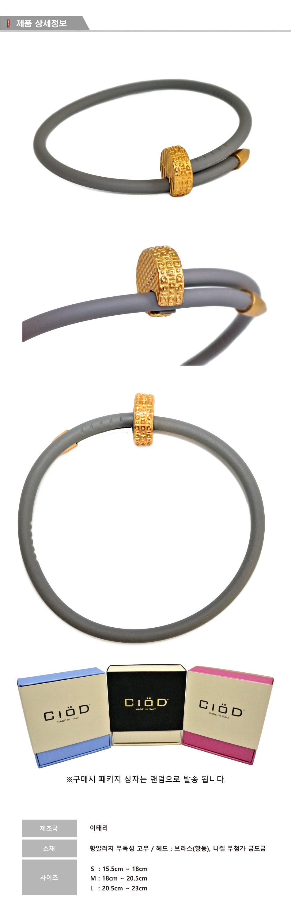 이탈리아 Luca Cantamessa에 의해 탄생한 CiöD는 우리 삶 속에 흔히 볼 수 있는 투박하고 거친 "못"에서 세련된 악세사리로의 화려한 변화. 이질적인 두 물체, 고무와 금속의 조화로운 결합으로 유럽 여러 매체로부터 찬사와 호평을 받으며, 세계 최고의 편집 매장 파리 콜레트 입점에 성공한 CiöD.
