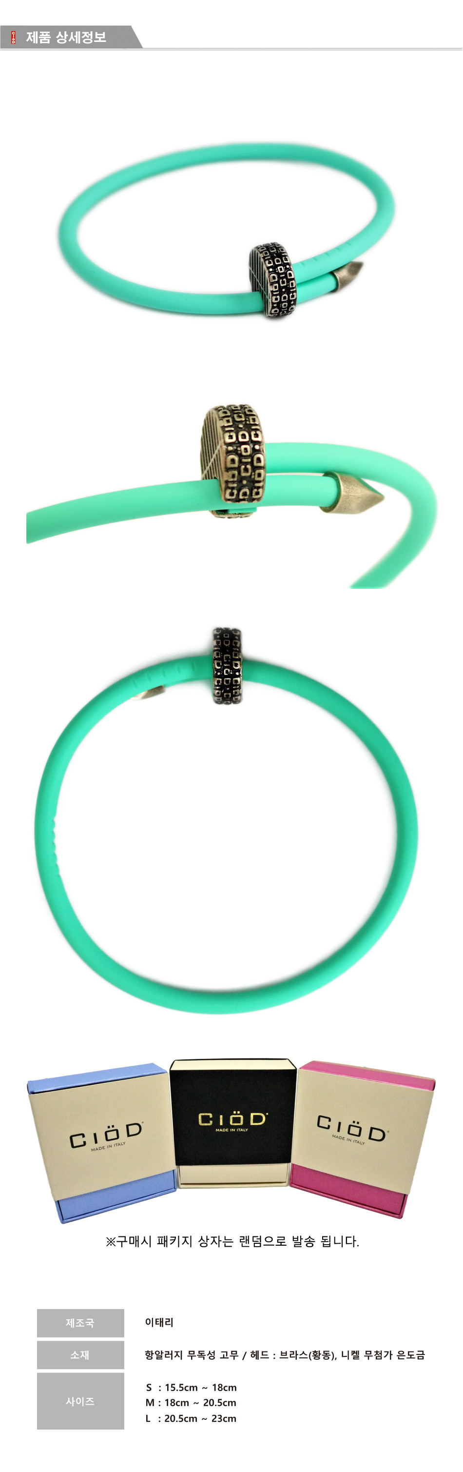 이탈리아 Luca Cantamessa에 의해 탄생한 CiöD는 우리 삶 속에 흔히 볼 수 있는 투박하고 거친 "못"에서 세련된 악세사리로의 화려한 변화. 이질적인 두 물체, 고무와 금속의 조화로운 결합으로 유럽 여러 매체로부터 찬사와 호평을 받으며, 세계 최고의 편집 매장 파리 콜레트 입점에 성공한 CiöD.